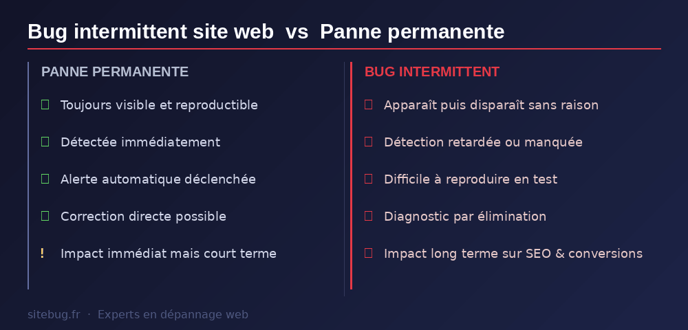 Contrairement à une panne franche — où le site est systématiquement inaccessible — un bug intermittent de site web se manifeste de façon aléatoire : parfois sous charge, parfois à heure fixe, parfois uniquement pour certains utilisateurs ou certains navigateurs. Sa dangerosité tient précisément à son caractère imprévisible.