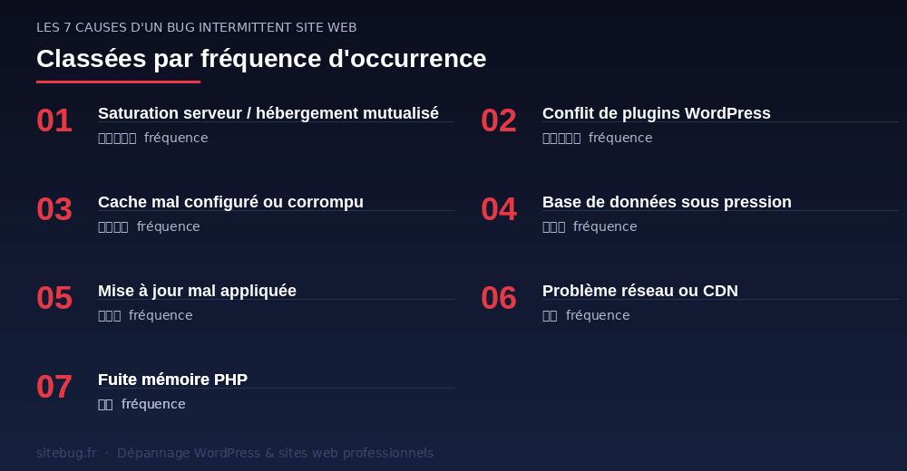 Derrière chaque bug intermittent site web, il y a une cause technique précise. En voici les sept plus fréquentes, classées par probabilité d'occurrence.