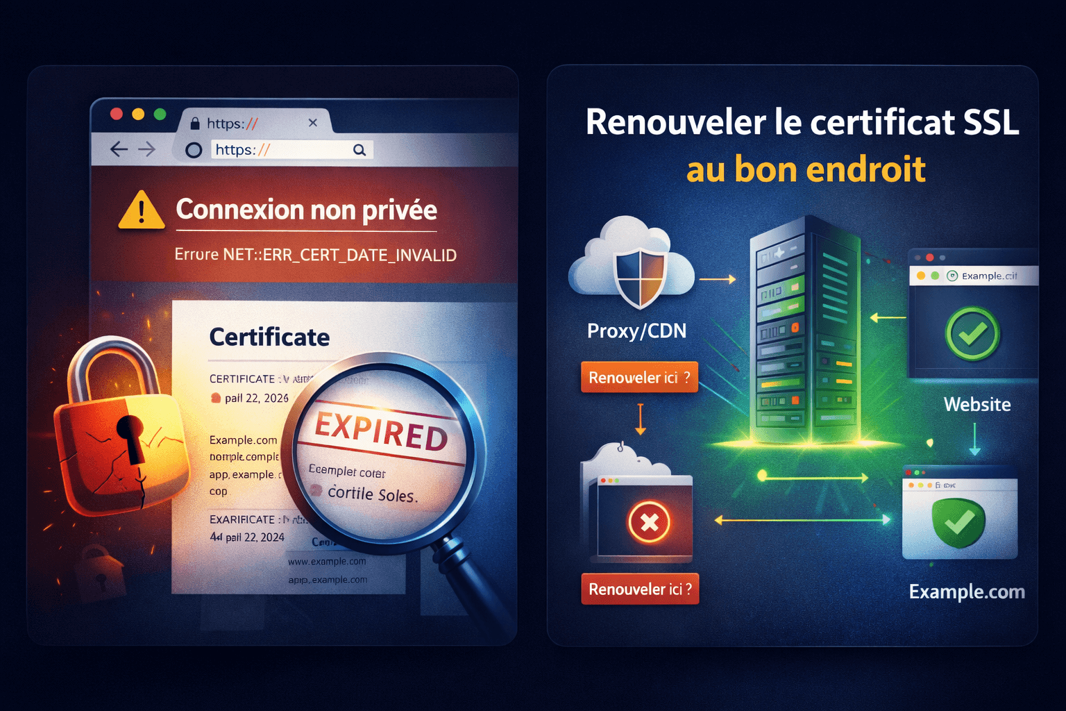 Un certificat SSL non renouvelé est l’un des incidents les plus courants… et l’un des plus évitables. Ce qui fait la différence, ce n’est pas “aller vite” à tout prix. C’est aller vite dans le bon ordre et le processus de dépannage : diagnostiquer, identifier où le certificat est servi, renouveler au bon endroit, appliquer, puis nettoyer les effets secondaires (redirections, contenu mixte, HSTS).