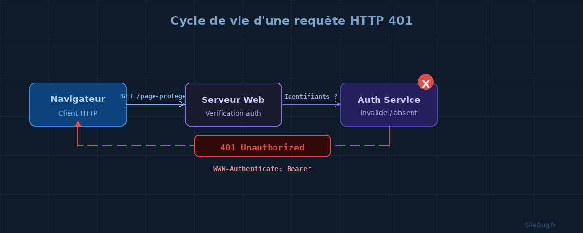 Le message varie selon le navigateur. Sur Chrome ou Edge, vous verrez généralement une icône de feuille blanche accompagnée d'un message générique basique. Sur Firefox, une boîte de dialogue d'authentification peut s'ouvrir. Sur Safari, la page reste blanche avec un texte sobre. Côté serveur, les variations incluent : 401 Unauthorized, HTTP Error 401.1 – Unauthorized: Logon Failed (IIS), 401 Authorization Required (Apache). Tous désignent le même problème : l'accès est bloqué faute d'authentification.