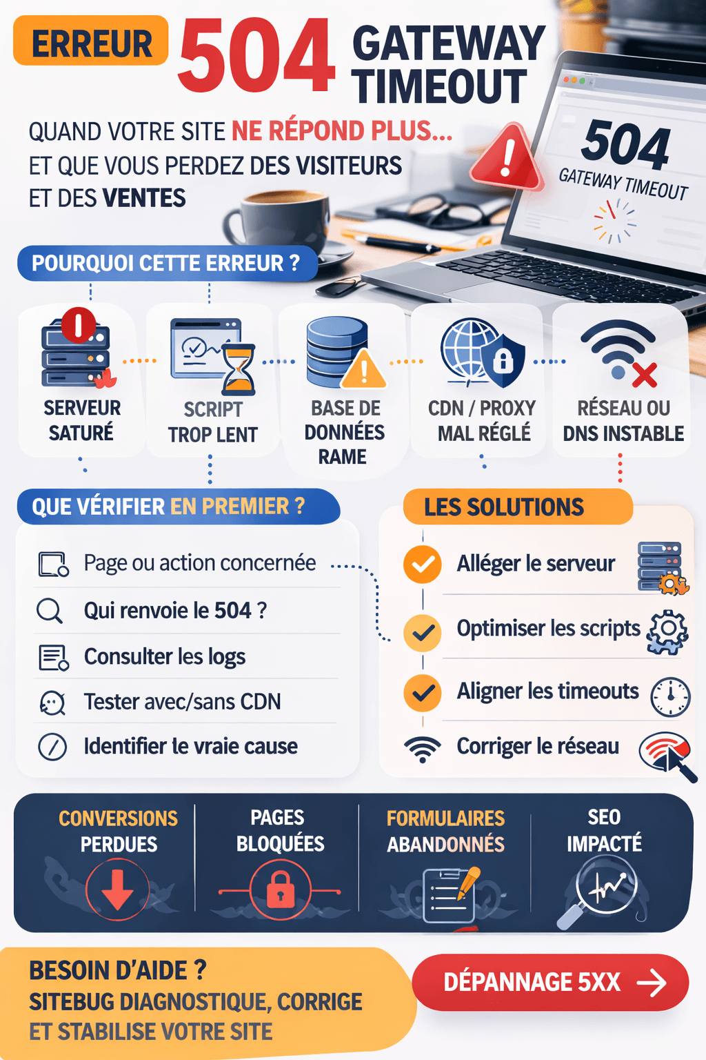 Ici, on va faire simple et utile : comprendre l’erreur 504 gateway timeout, identifier les causes courantes, puis voir comment résoudre l’erreur sans jouer à “modifier vos paramètres” au hasard. Et si vous n’avez pas envie de passer votre soirée dans les journaux du serveur, n'hésitez pas à faire appel à SiteBug !